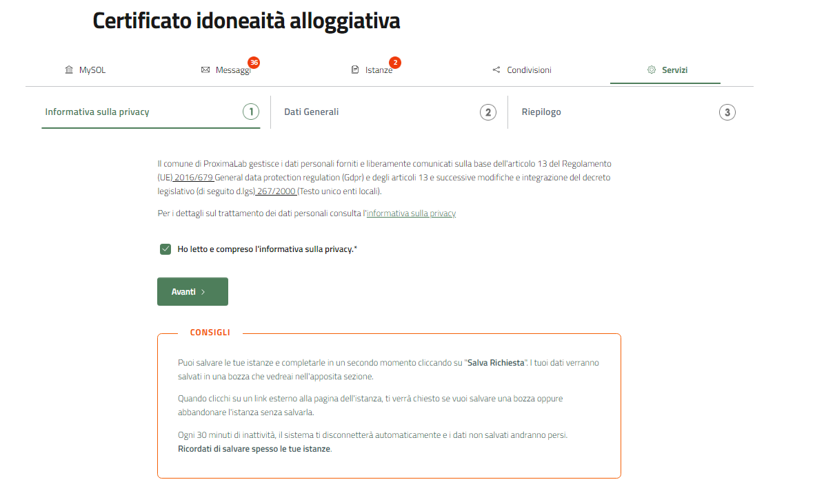 Il primo passo per richiedere il certificato di idoneità alloggiativa, è l'accettazione dell'informativa privacy.