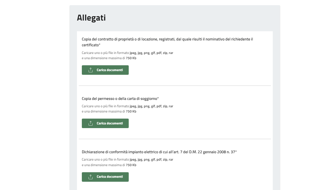 Allegare tutti i documenti richiesti cliccando su "Carica Documenti" e selezionandoli dal proprio dispositivo.