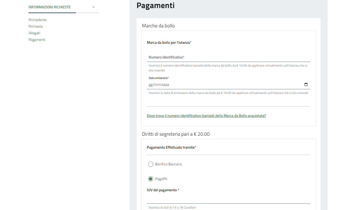 Il pagamento dei diritti invece può essere corrisposto mediante bonifico, inserendo il CRO o pagopa, inserendo lo IUV generato in modalità spontanea sulla piattaforma Pagopa presente sul sito.
