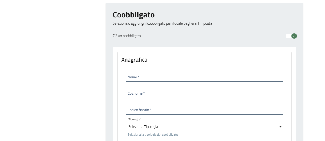 Indicare se, oltre al Richiedente va indicato il Coobbligato. Nel caso, selezionare e popolare tutti i campi.