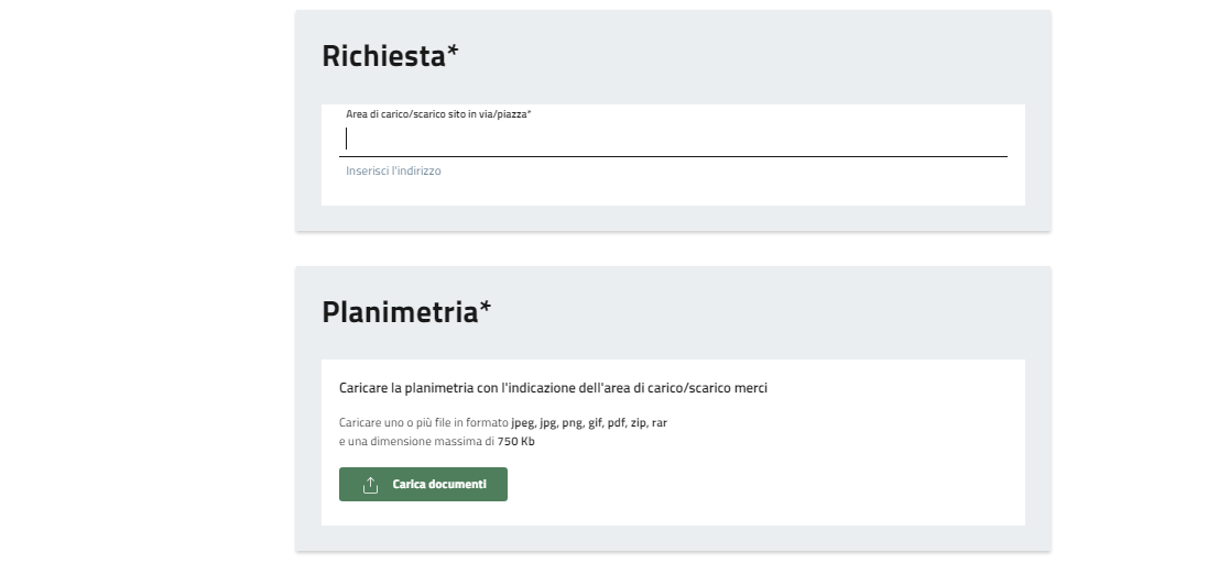 Precisare l'indirizzo e caricare la planimetria di occupazione dell'area