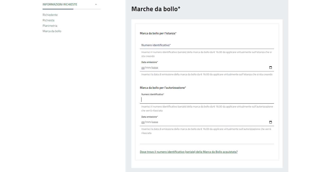 Le marche vanno indicate nell'apposito box, inserendo il numero identificativo e la data di emissione stampata su di esse.