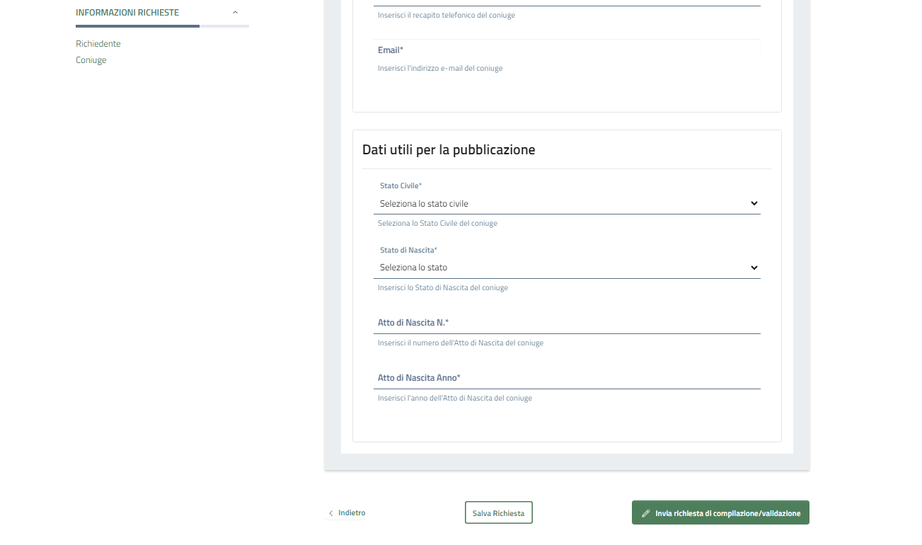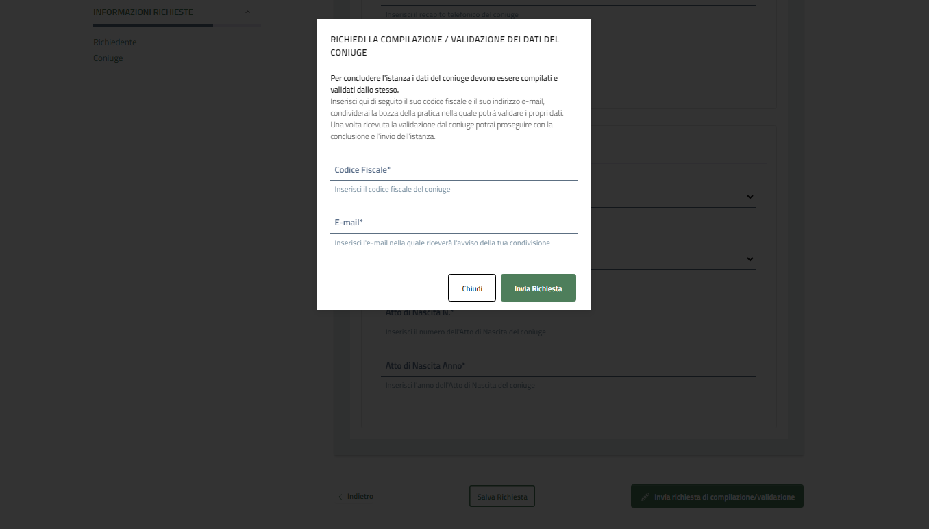 I dati del coniuge possono essere compilati dalla persona che ha effettuato il primo accesso, oppure compilati direttamente dal coniuge dopo avere inviato la richiesta.