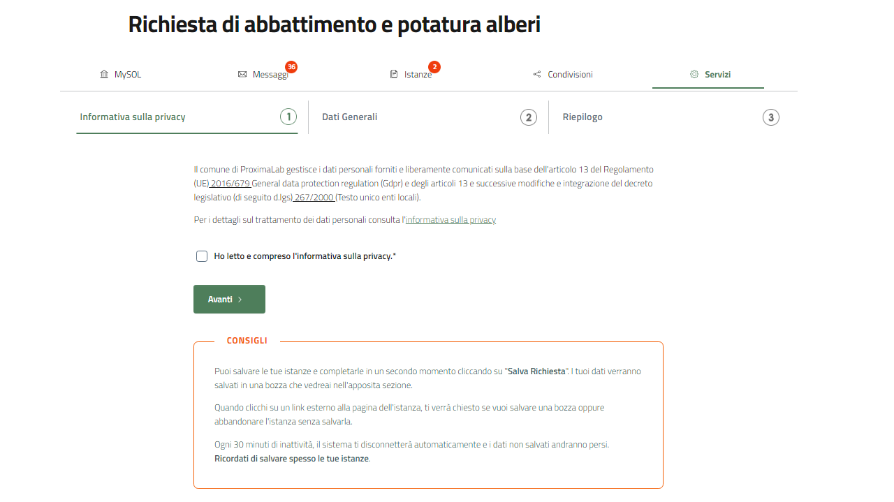 Il primo passo per richiedere l'abbattimento o la potatura degli alberi, è l'accettazione dell'informativa privacy.