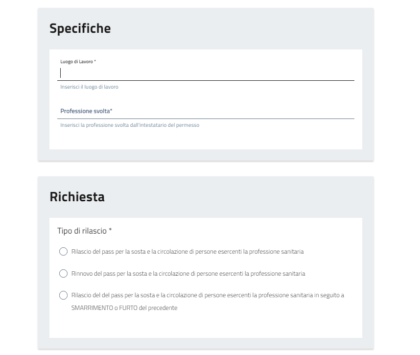 Indicare il luogo di lavoro, la professione svolta, e indicare il motivo della richiesta, se per rilascio, rinnovo o riemissione.