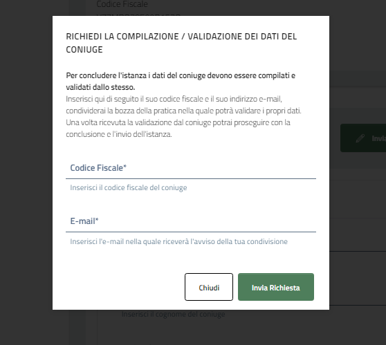 Dopo aver compilato i dati, o volendo farli compilare in toto al coniuge, cliccare su "Invia richiesta di compilazione/validazione".