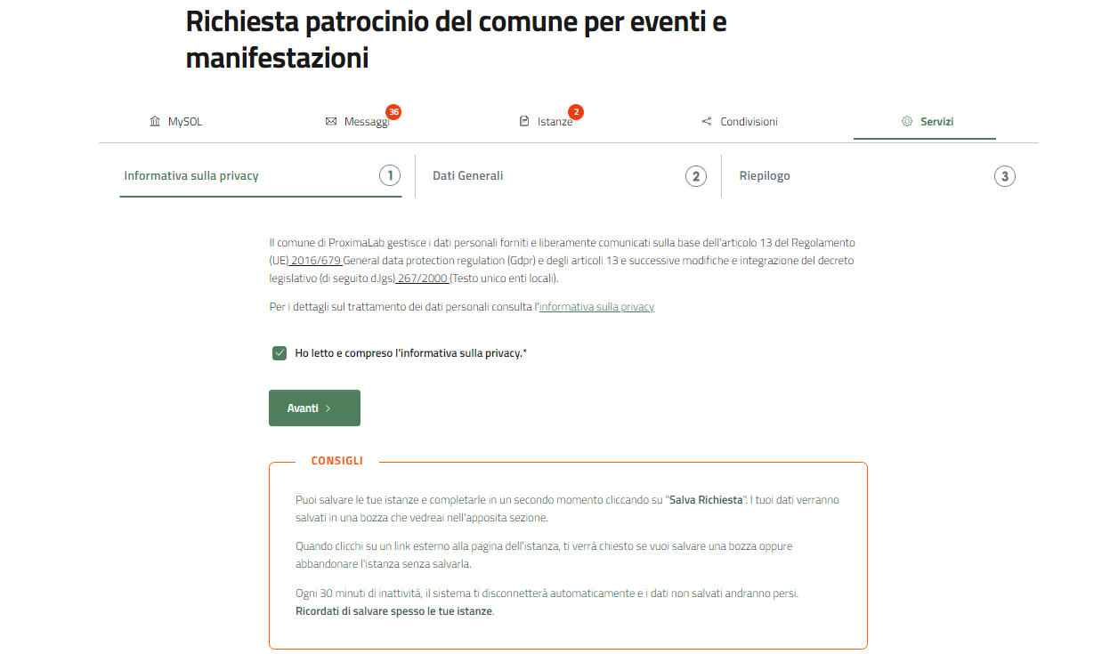 Il primo passo per richiedere il patrocinio del comune per eventi e manifestazioni, è l'accettazione dell'informativa privacy.
