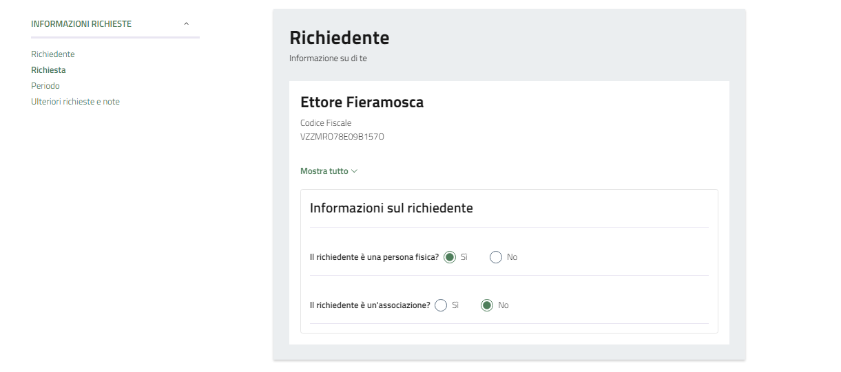 Indicare se il richiedente è una persona fisica o il rappresentante di un'associazione
