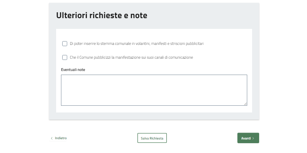 Nel caso sia necessario indicare ulteriori richieste e note
